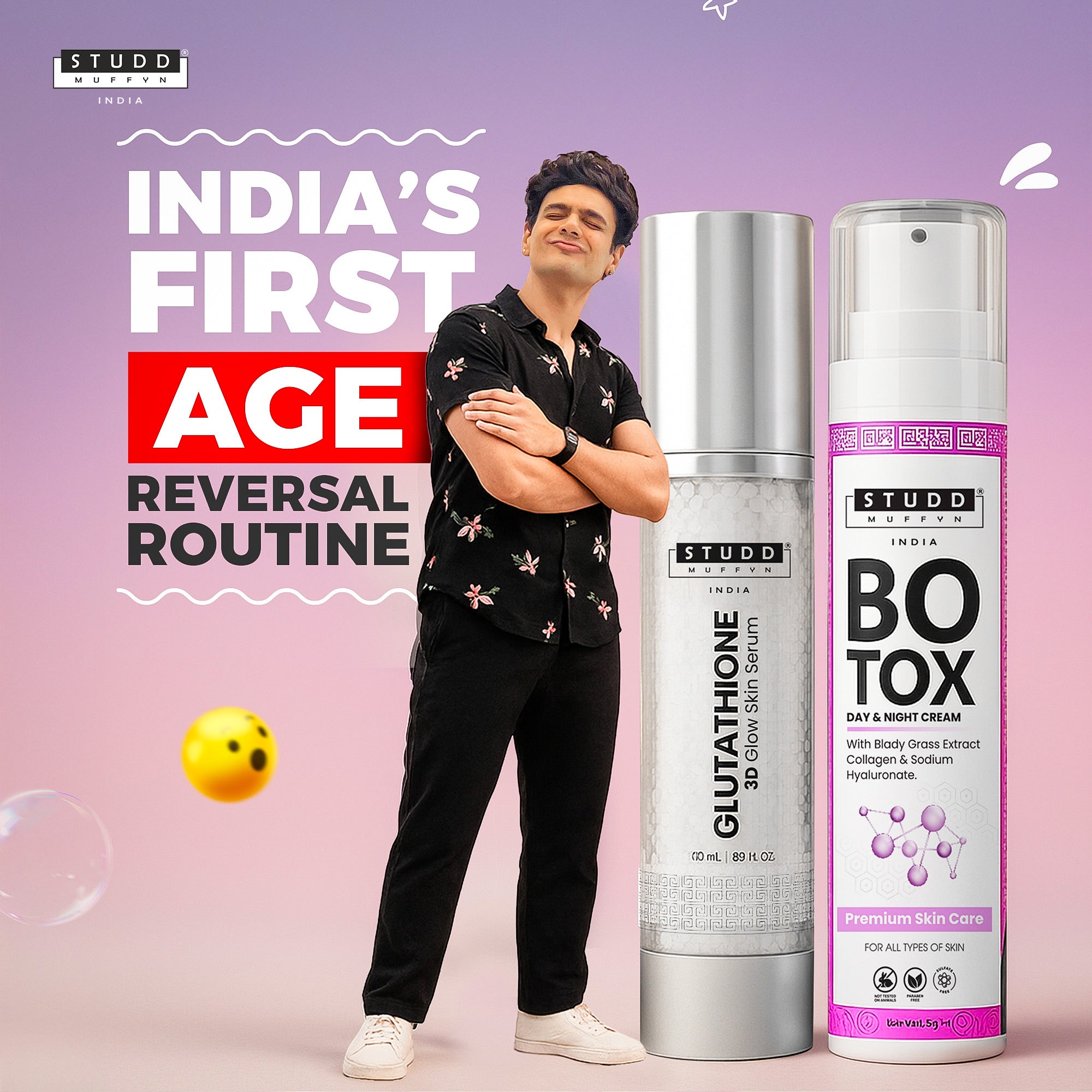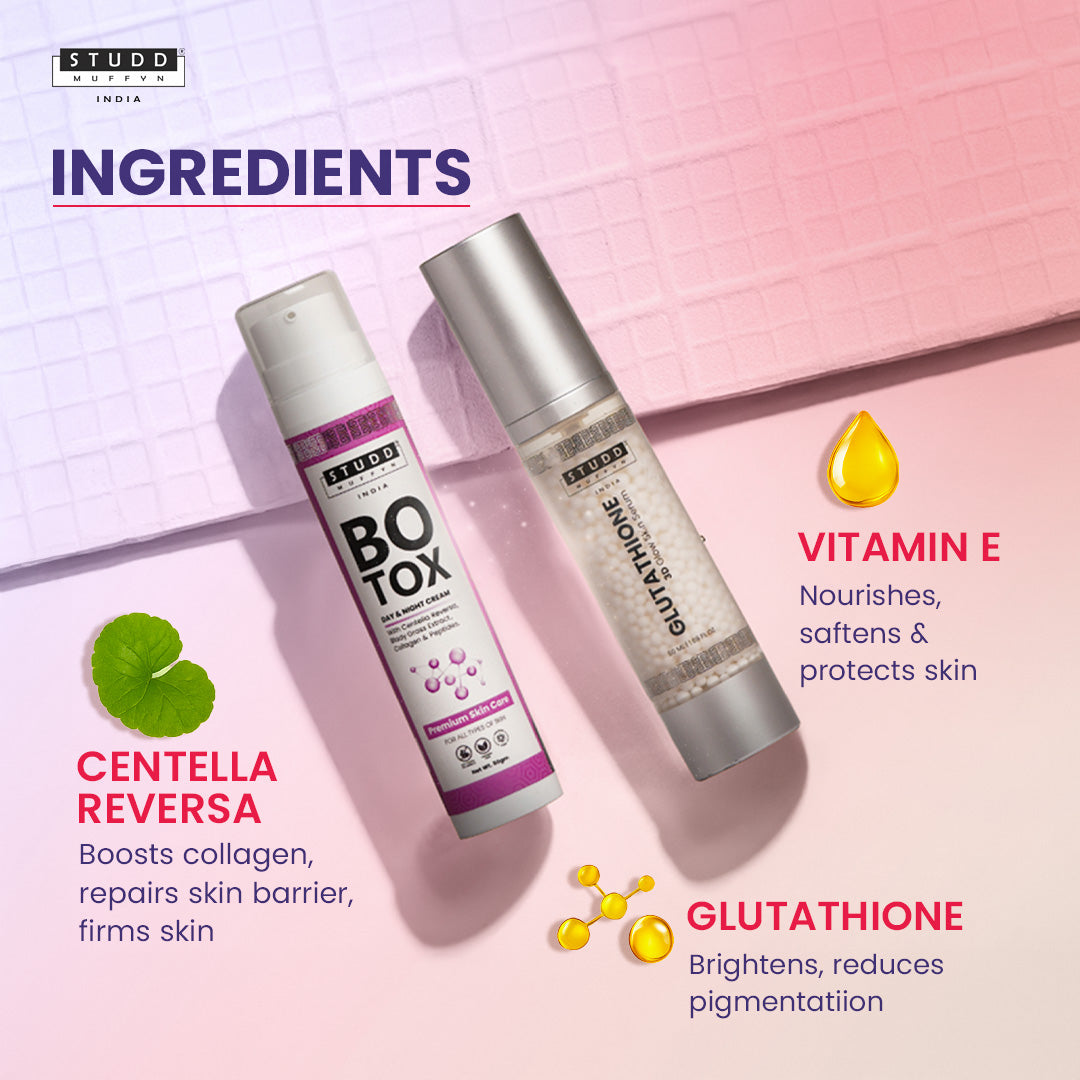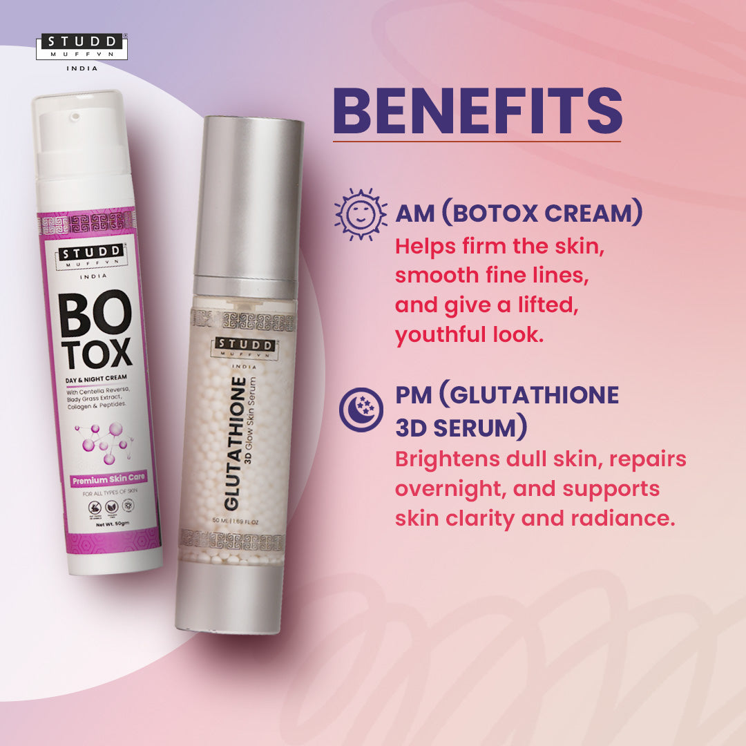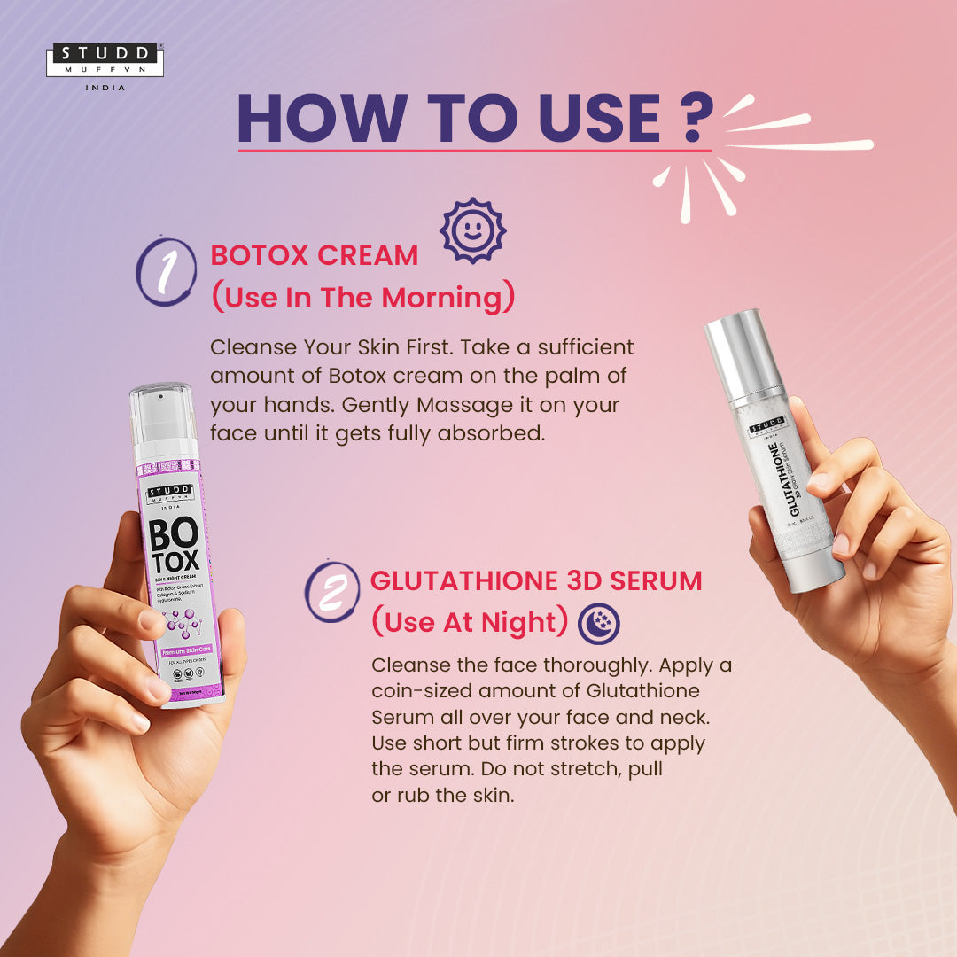 BOTOX CREAM (Use In The Morning) ➨Cleanse Your Skin First. ➨Take a sufficient amount of Botox cream on the palm of your hands. ➨Gently Massage it on your face until it gets fully absorbed. GLUTATHIONE SERUM (Use At Night) Cleanse the face thoroughly. Apply a coin-sized amount of Glutathione Serum all over your face and neck. Use short but firm strokes to apply the serum. Do not stretch, pull or rub the skin.