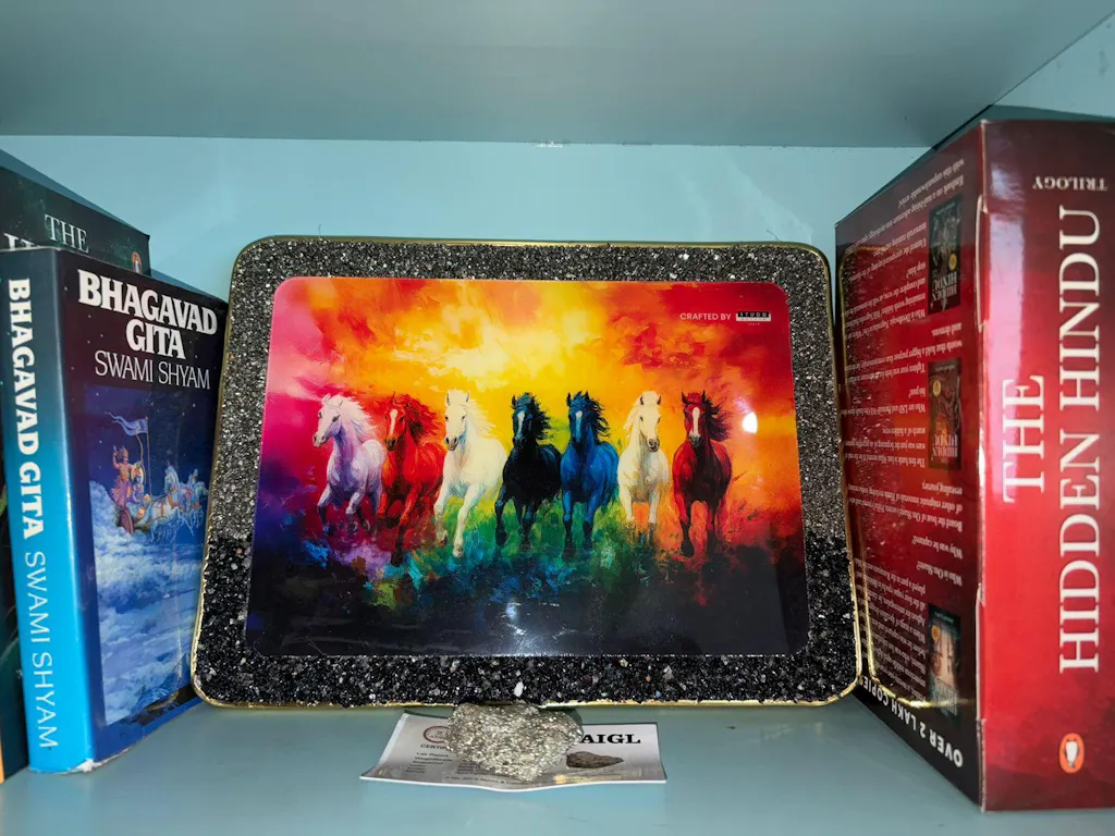Featuring seven radiant stallions galloping in unison, this artwork symbolizes momentum, determination, and cosmic balance. Each colour represents a spectrum of energy – together creating the perfect harmony to power up your life journey.