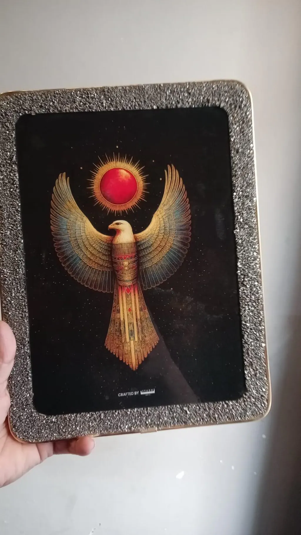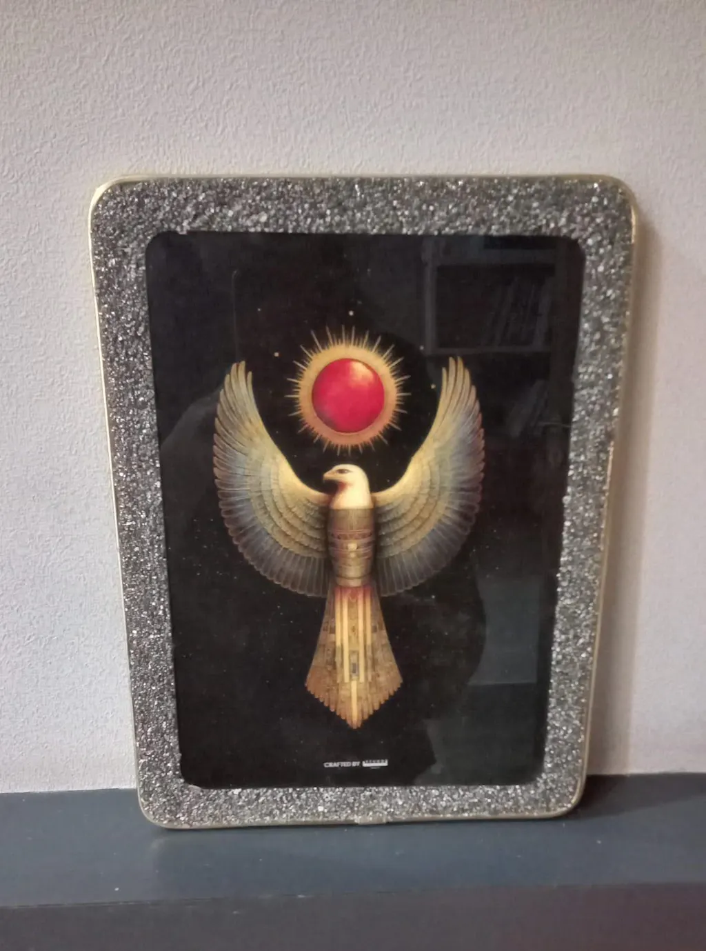 The eagle, a universal symbol of freedom and leadership, rises here with a radiant solar crown – a sign of illumination, guidance, and divine blessings. Ideal for home décor, spiritual spaces, or as a statement gifting piece, this artwork captures the true essence of strength, clarity, and wealth.