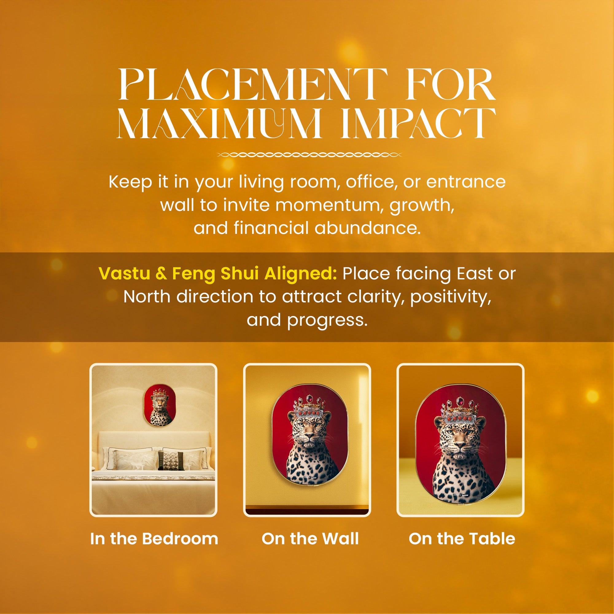 Command respect, speed, and strength with the majestic Cheetah Pyrite Plate. The artwork showcases a regal cheetah crowned in glory, symbolizing leadership, courage, and swift progress. Crafted with the powerful synergy of Pyrite, the stone of wealth and protection, and Red Jasper, the stone of vitality and strength, this plate radiates unstoppable confidence and authority.