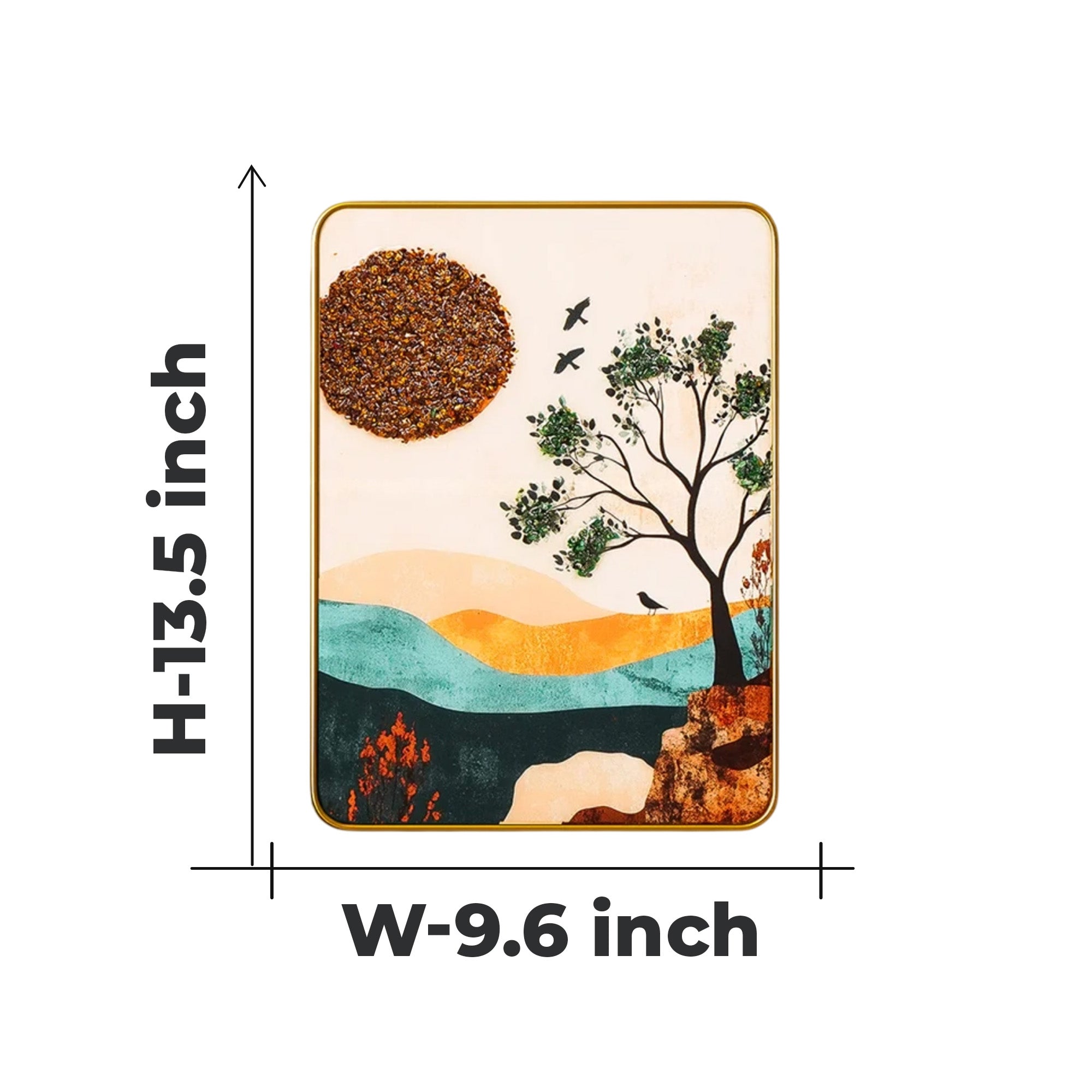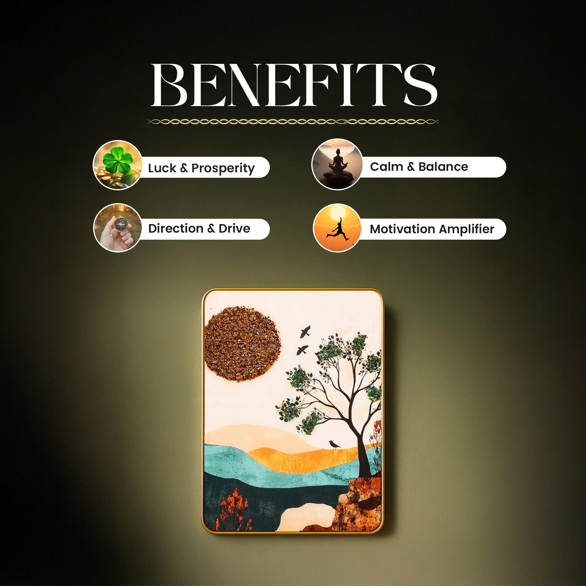 This unique wall art features a scenic blend of layered landscapes and flying birds, symbolizing growth, balance, and aspiration. The golden sun is handcrafted with Tiger Eye – the crystal of courage and confidence – while the tree leaves shimmer with Green Aventurine, known for inviting luck, opportunity, and emotional clarity.