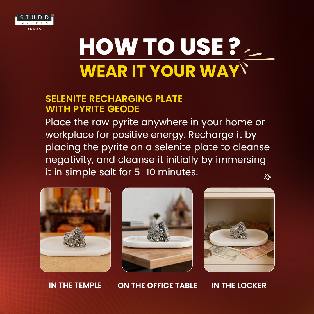 ✡How To Use: You can place the raw pyrite anywhere at your home or workplace. ✡Recharge: Place the pyrite geode on the Selenite plate to recharge and clean away any negative energy. ✡Cleansing: Once you receive your crystal, it is essential to do a cleansing and activating ritual to make this crystal YOURS! For that keep it immersed in simple salt for 5-10 minutes.