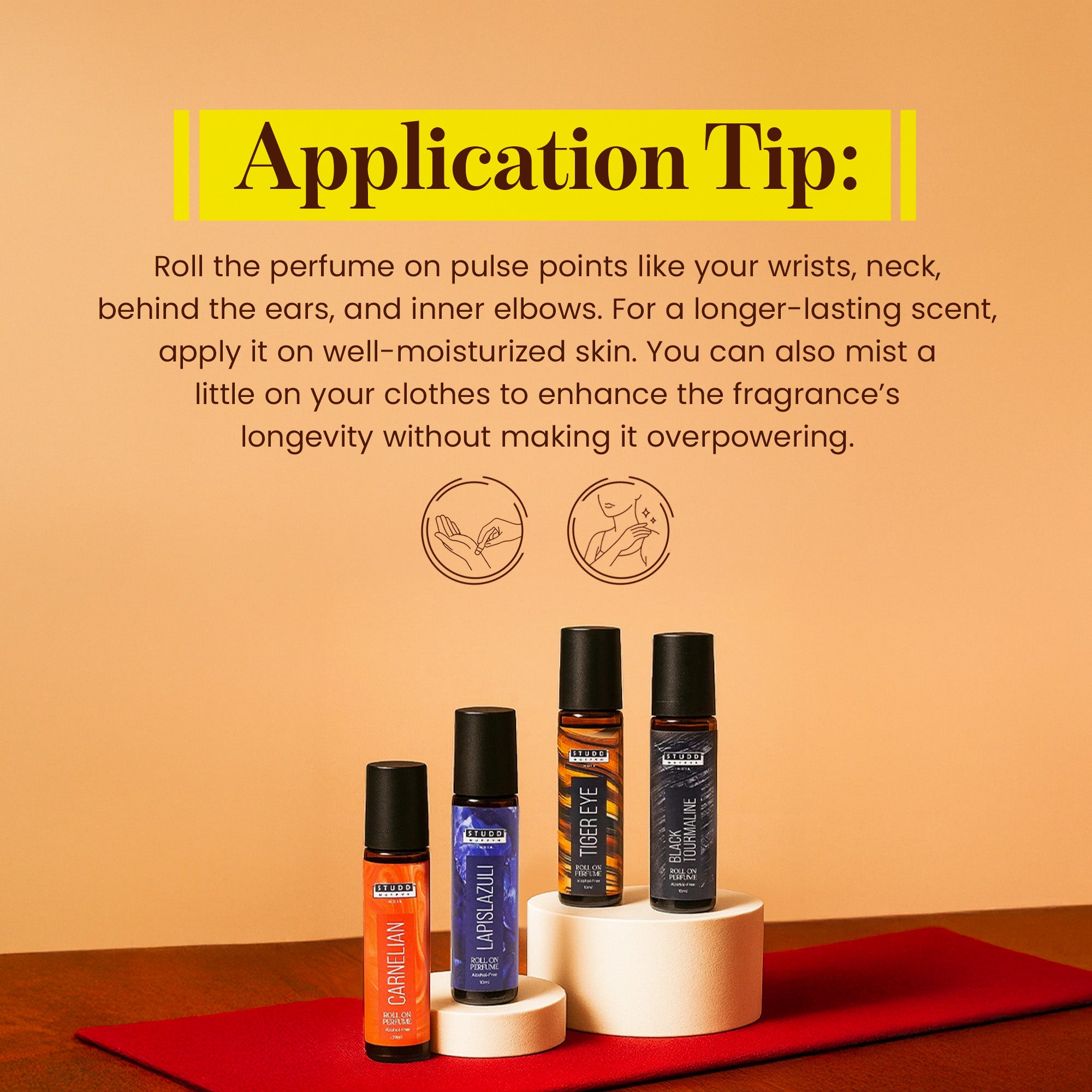 ✅ Roll on Pulse Points – Wrists, neck, behind ears & inner elbows. ✅ Apply on Moisturized Skin – Lasts longer on hydrated skin. ✅ Mist on Clothes – Enhances longevity without overpowering. CAUTION: Discontinue use if irritation occurs. Even natural ingredient may cause allergies to some Patch test is recommended on elbow before use. Store in cool & dry place. Avoid contact with eyes, if contact occurs, rinse well with cool water LEGAL DISCLAIMER : Product Color May Change Overtime. This Is Due To The Presence Of Natural Ingredients. This Does Not Change The Efficacy Of The Product. Caution: Store In A Cool & Dry Place. Discontinue Use If Irritation Occurs. Even Natural Ingredient Can Cause Allergy To Some. To Check Patch Test On The Back Of The Elbow For 15 Minutes. Avoid Contact With Eyes. For External Use Only.