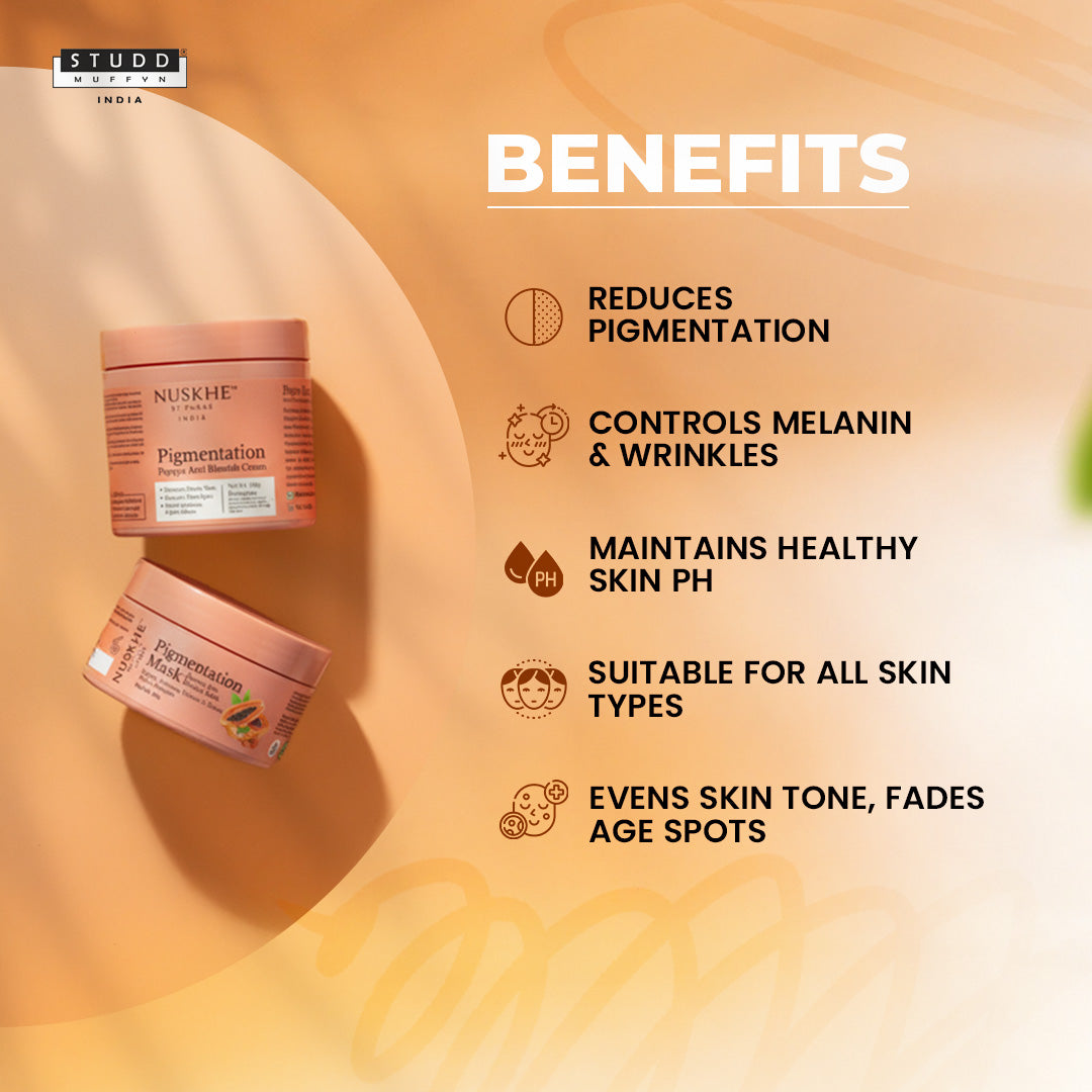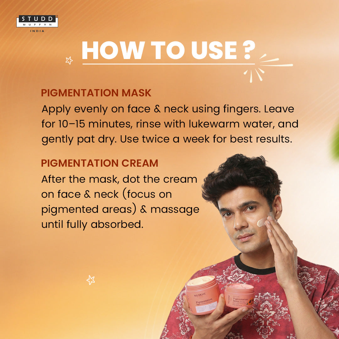 Pigmentation Mask Start by spreading the mask all over your face and neck with your index and middle finger. Leave it for 10-15 minutes and then rinse it with Luke warm water and then dap your skin with a cotton towel. Studd Muffyn Suggests you to use it Twice a week for better results. Pigmentation Cream 1-After pigmentation mask apply dots of cream all over the face and neck focusing on pigmented areas. 2-Smoothen till the skin absorbs it.
