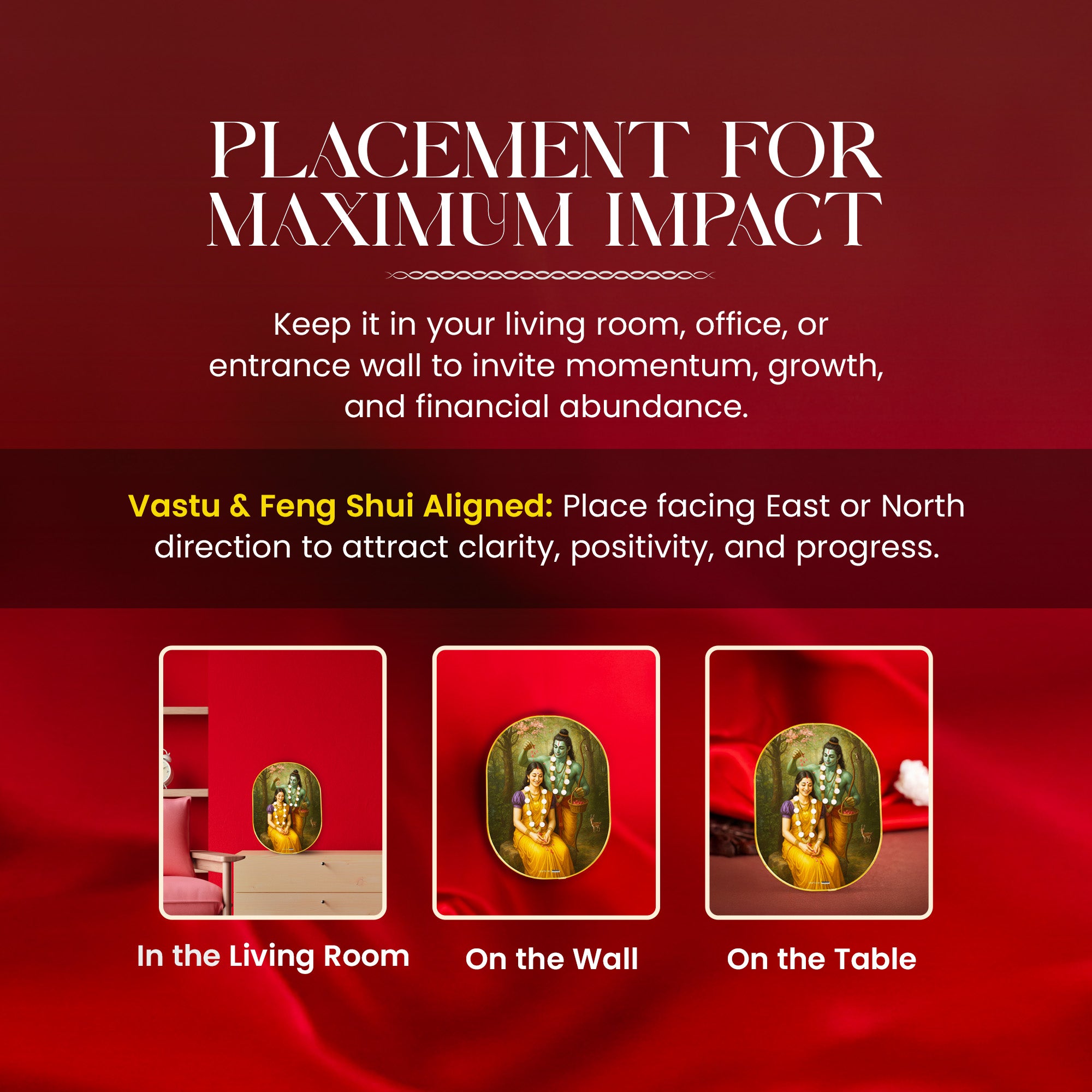 ✨ How to Use: Placement for Prosperity – Keep it in your living room, office, or entrance wall to invite momentum, growth, and financial abundance. Vastu & Feng Shui Aligned – Place facing East or North direction to attract clarity, positivity, and progress. Energize Your Space – The embedded rose quartz crystal radiates affection-attracting vibrations that uplift your environment. Daily Intention Setting – Stand before the artwork, take a deep breath, and affirm your goals while visualizing the framed artwork charging ahead with your dreams. Sacred Decor – Use as a spiritual décor piece that not only beautifies but also harmonizes energy flow at home or the workplace.