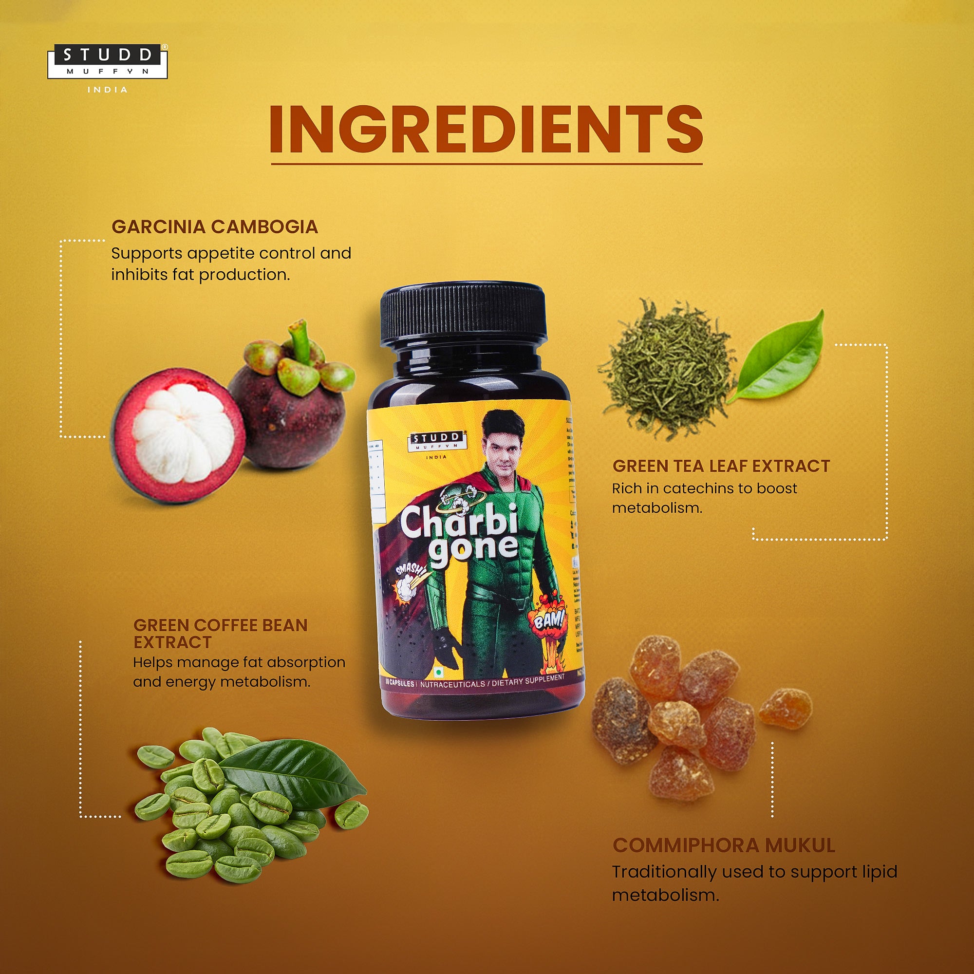 Hero Ingredients Garcinia Cambogia (Fruit Rind) Extract (60% HCA) – 600 mg Supports appetite control and inhibits fat production. Green Tea Leaf Extract 95% – 200 mg Rich in catechins to boost metabolism. Green Coffee Bean Extract (50% CGA) – 100 mg Helps manage fat absorption and energy metabolism. Commiphora Mukul Extract – 100 mg Traditionally used to support lipid metabolism. Top-Rated Fat-Loss Blend Trusted by Thousands Clinically Researched Ingredients for Visible Results High Repeat-Purchase Rate Among Fitness-Focused Users Known as a Trust-worthy Fat-Loss Solution for Disciplined Goals