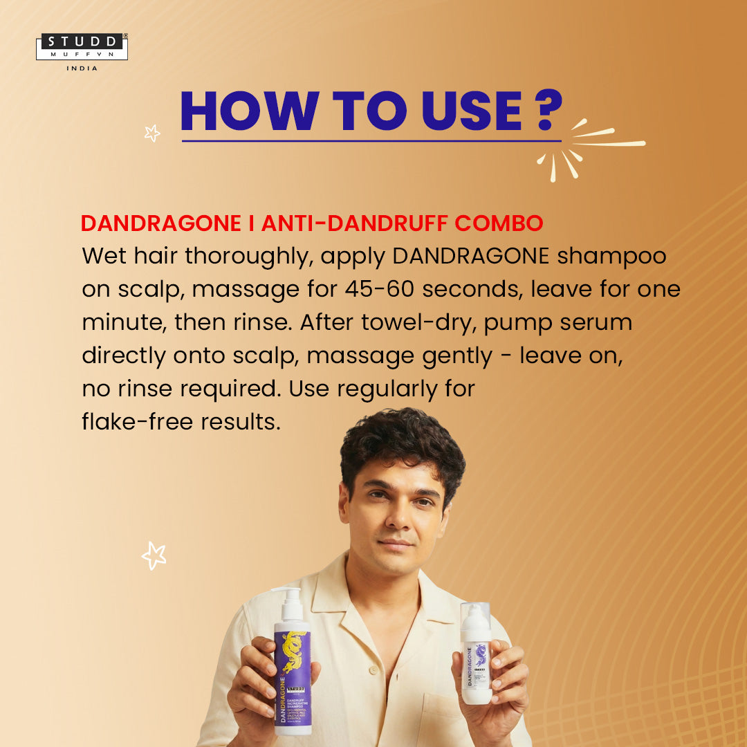 Step 1 — Shampoo (DANDRAGONE Anti-Dandruff Shampoo) Apply on wet scalp Massage for 45–60 seconds Leave for 1 minute for actives to work Rinse thoroughly Step 2 — Serum (DANDRAGONE Dual Chamber Serum) Pump fresh-activated serum on scalp Apply directly on affected areas Massage lightly for absorption Leave on — no rinse Use daily for best results
