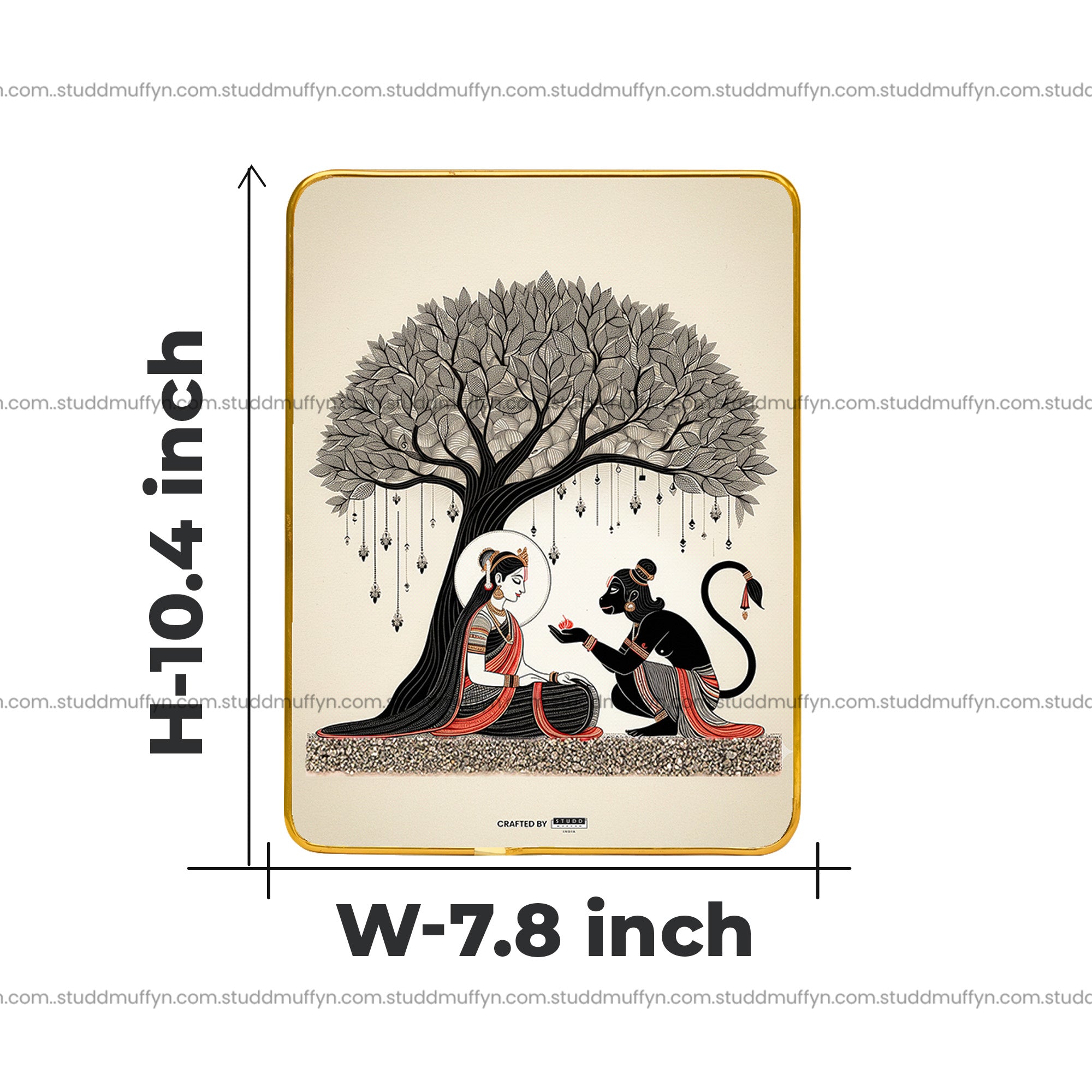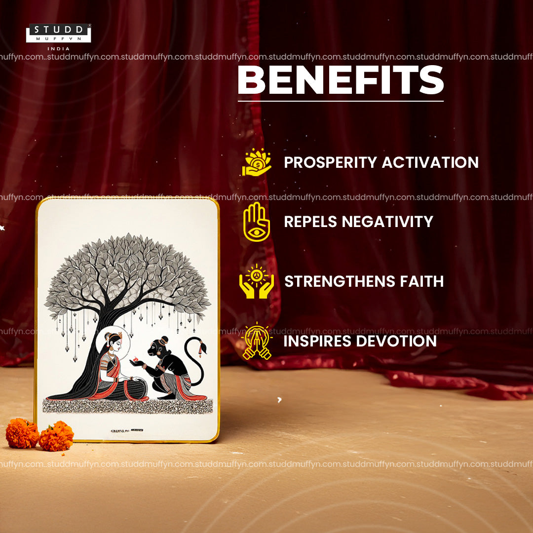 A beautiful keepsake to attract strength & blessings into your home. Inside this sacred art plate lies a beautifully hand-illustrated moment from the Ramayana — Maa Sita and Lord Hanuman beneath the divine Ashok tree — intricately detailed to capture every emotion of devotion and hope.