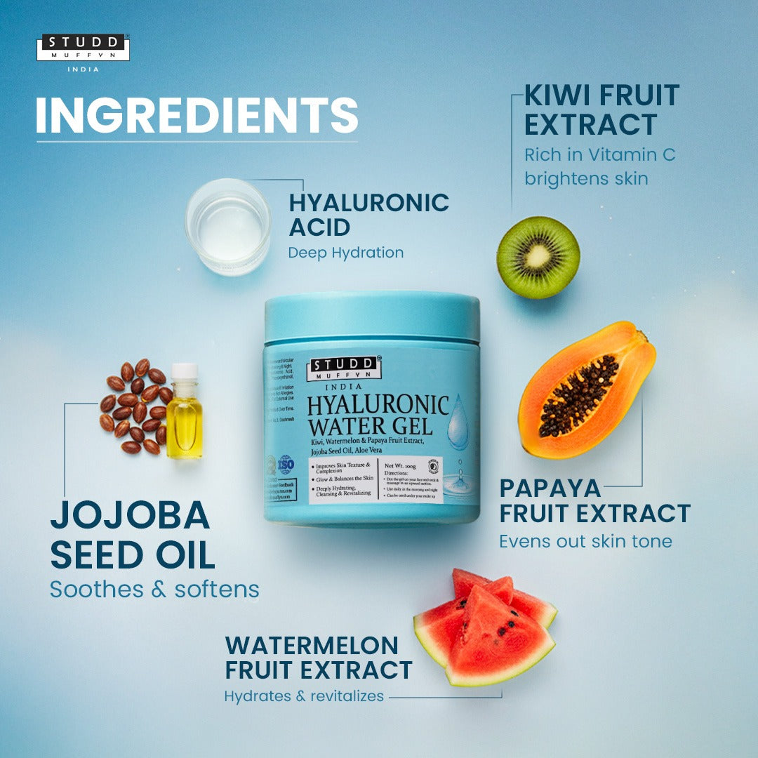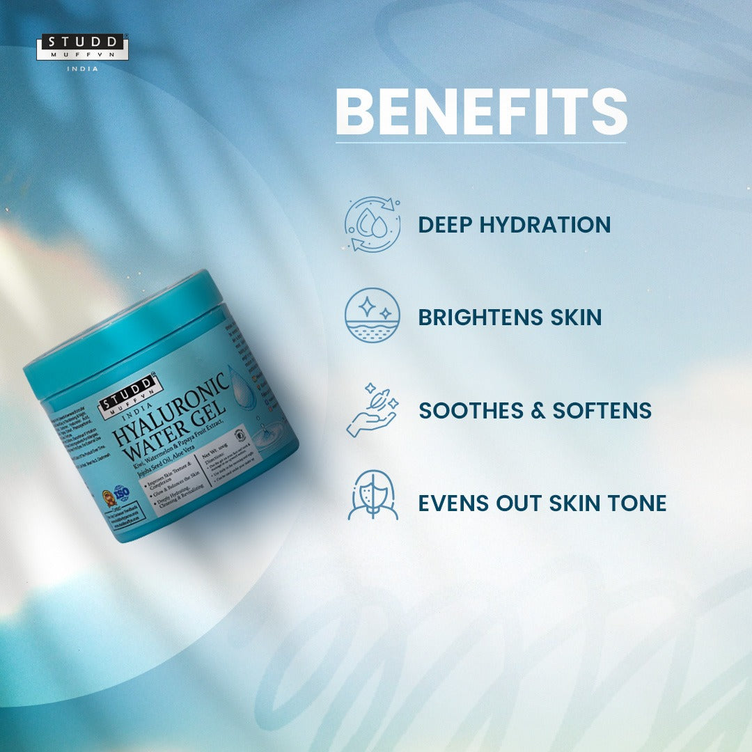 Start your day with deep, lasting hydration. Studd Muffyn Hyaluronic Water Gel is powered by pure Hyaluronic Complex that pulls moisture deep into your skin and keeps it locked in all day.