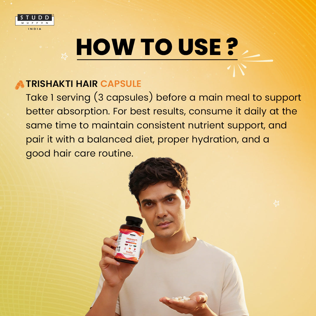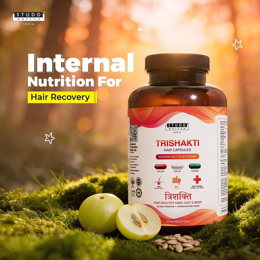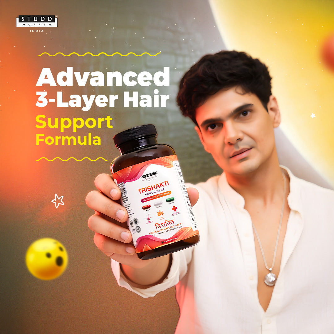 Trishakti Hair Capsules by Studd Muffyn are a comprehensive daily nutrition formula designed to support healthy hair, a balanced gut, and overall well-being. This triple-action formulation works from within to nourish hair roots, support digestion, and fulfil daily vitamin and mineral requirements—making it more than just a hair supplement.