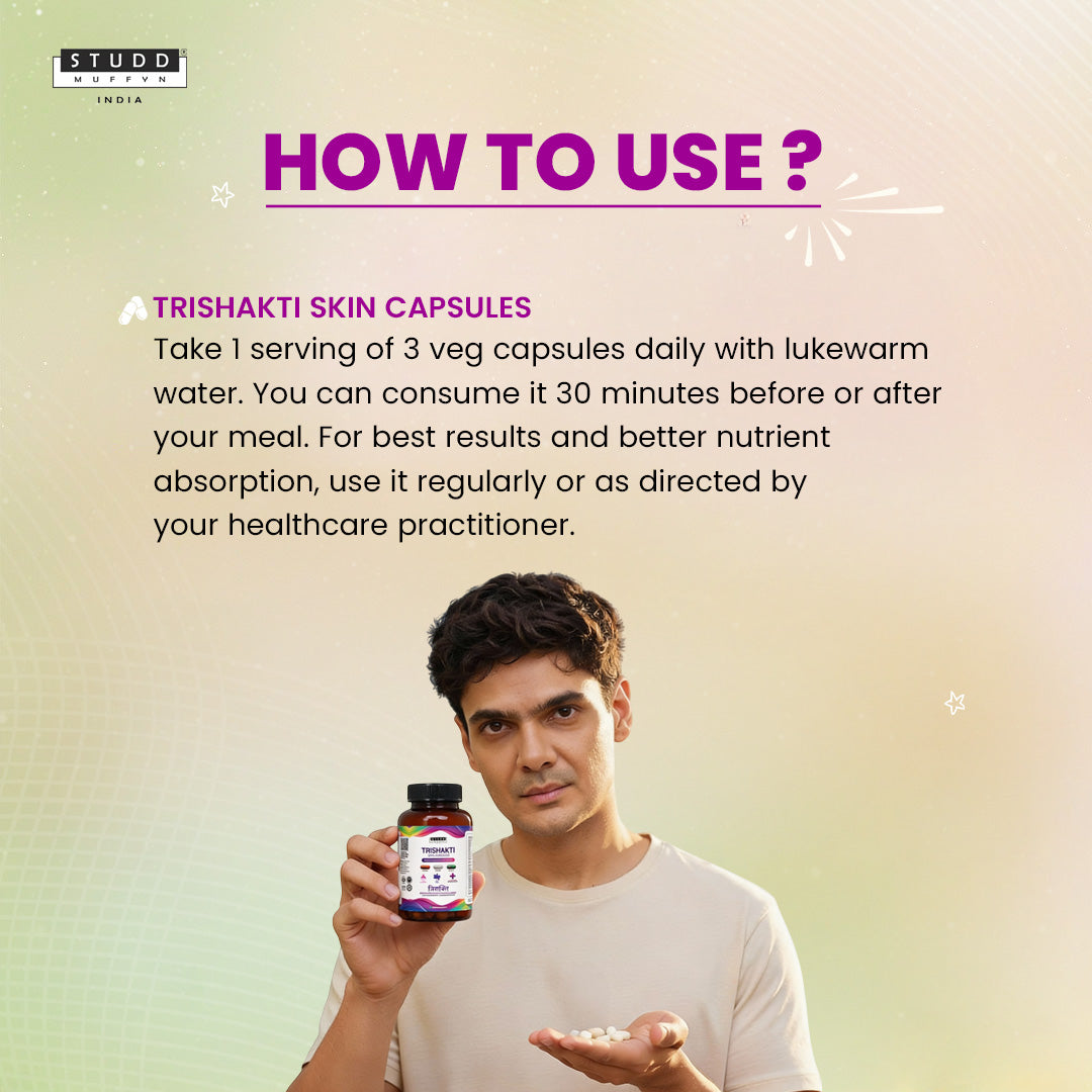 Trishakti Skin Capsule is a daily nutraceutical product designed to support skin nourishment, digestive balance, and overall body wellness from within. This thoughtfully crafted triple-action formula brings together: